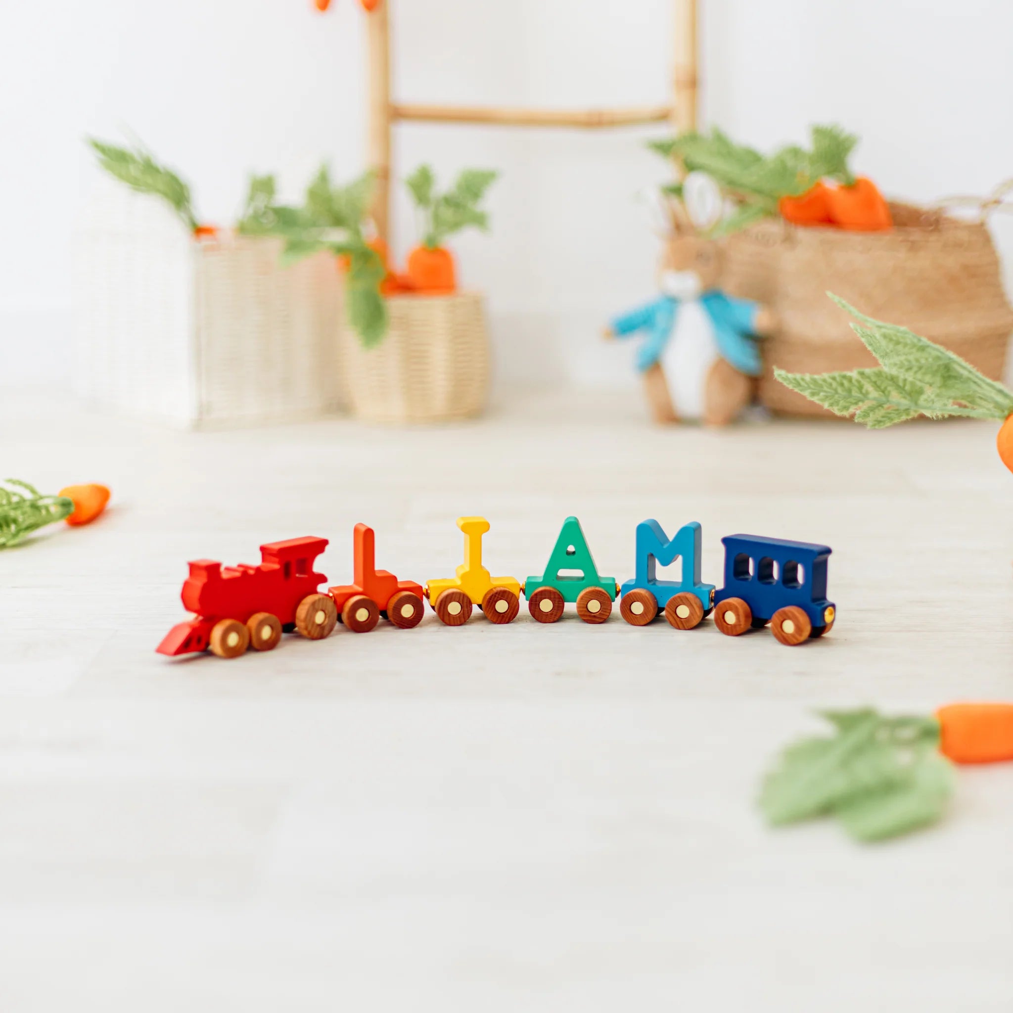 Personalized Wooden Name Train – Bright Primary Colors & Rainbow Edition Eco-Friendly Wooden Trains Busypuzzle